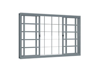 Janela de correr central de alumínio com 2fls móveis e 2 fixas e grade. Lucasa Alumínio