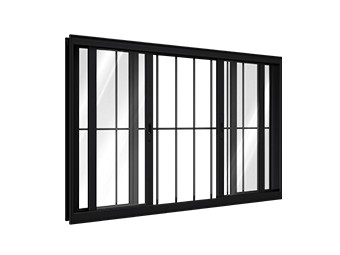 Janela de correr central de aço com grade quadrada. 2 fls móveis e 2 fixas. Ullian Riobras Aço