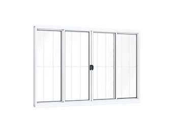 Janela de Correr Central 2flS Móveis e 2 Fixas Com Grade Quadrada. Aço cor branca. Lucasa Facilità.