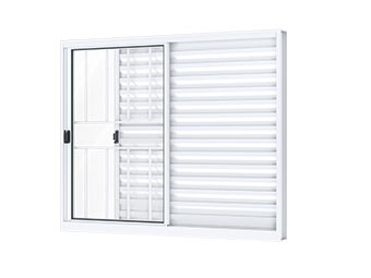 Janela veneziana de correr lateral de alumínio com 2 fls móveis e 1 folha fixa com grade quadrada. Ullian Riobras Alumínio.