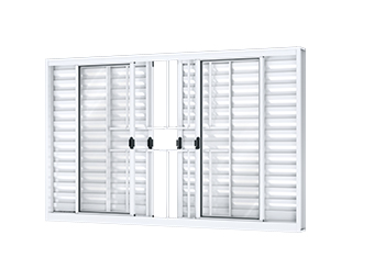 Janela veneziana de correr central de aço com grade quadrada. Lucasa Riobras