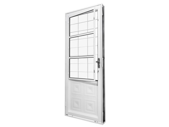 Porta de abrir com postigo e com grade quadriculada em aço pintado na cor branco, pronta para instalação. Proporcionam a entrada de luz natural ao ambiente e assegura maior resistência a impactos na base da porta. O postigo possibilita a ventilação ou arejamento do ambiente mesmo com a porta fechada. Ramassol PraticSol