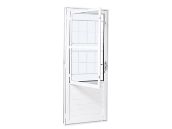 Porta de abrir c/postigo e c/ grade quadriculada. Aço cor branca. Ramassol UnicSol