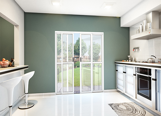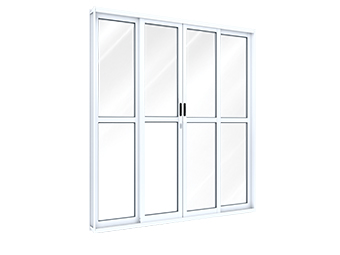 Riobras Alumínio. Porta de correr lateral de alumínio com 2 folhas móveis e 2 folhas fixas com travessa sem grade com pintura de acabamento com tinta poliéster a pó na cor branca e vidro liso incolor.