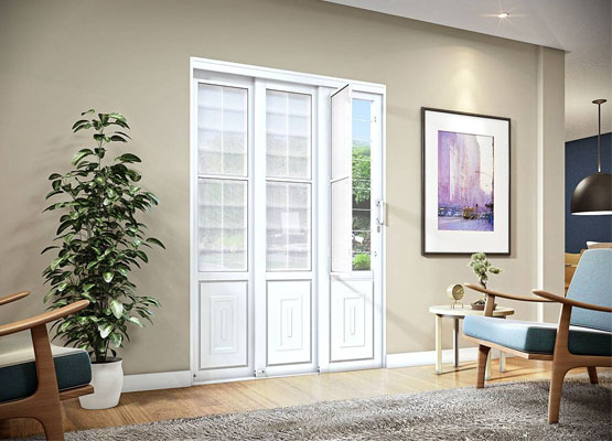 Porta de Correr Lateral Com Vidro 2fls Móveis e 1 Fixa. Aço cor branca. Lucasa Facilità.