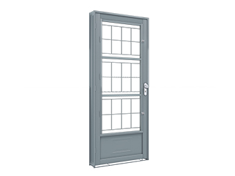Porta social de abrir com postigo e grade quadrada. Domarco Fortline