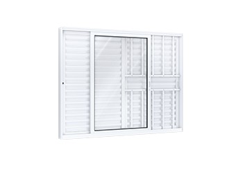 Janela veneziana em alumínio de correr lateral 2fls móveis e 1 fixa com grade. Lucasa Eccellente
